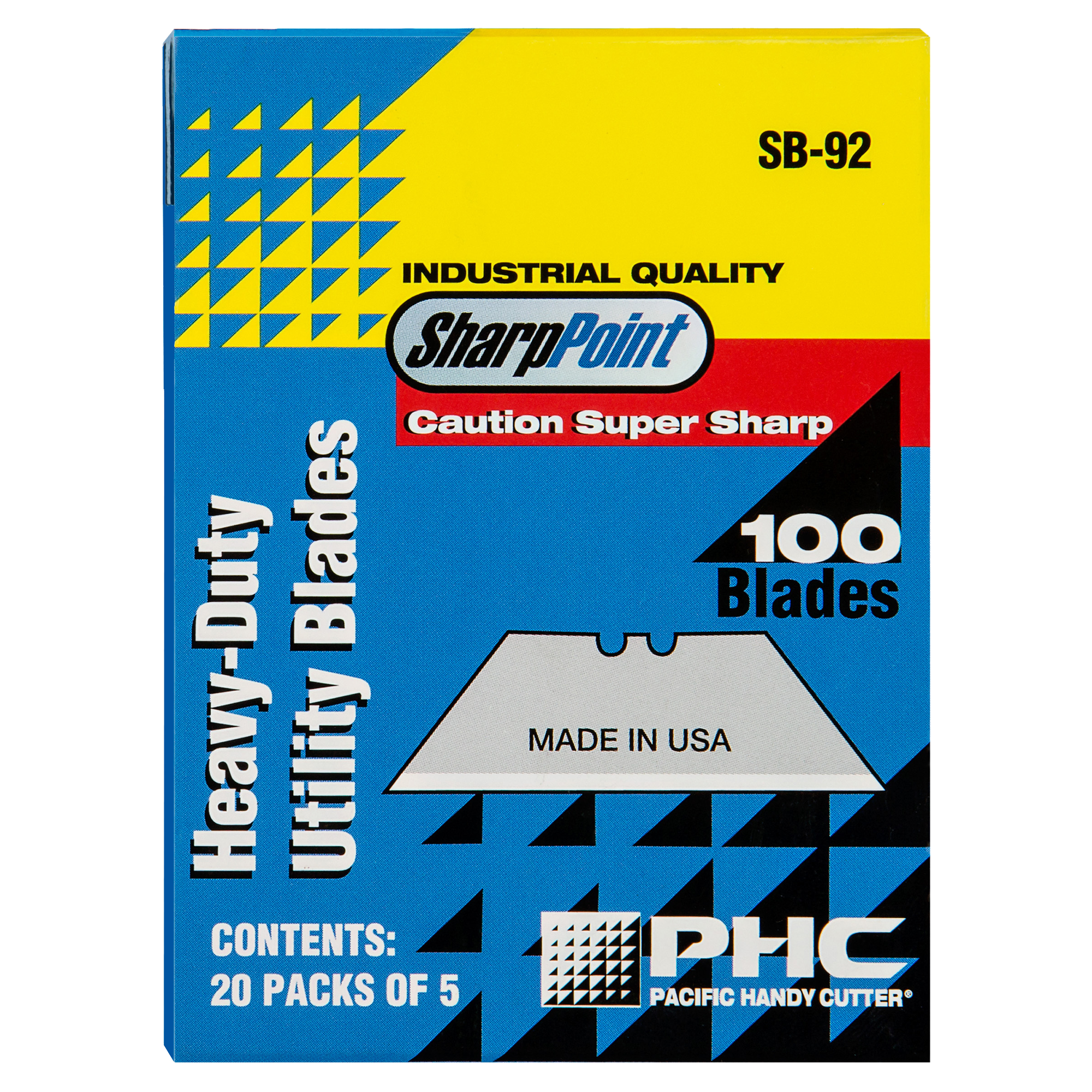The SB-92 Standard Utility Blades are high quality steel and hold a very sharp edge that lasts longer than other brands. These are ideal for tough jobs and complement our industrial line of PHC utility knives. The SB-92 Blades have the universal two-notch design and fit most standard utility knives on the market. The blades are packaged in a box of 100 blades and placed into tucks of five. For added convenience and safety the SB-92 Blades can also be purchased in our QBD-324 Blade Dispenser.